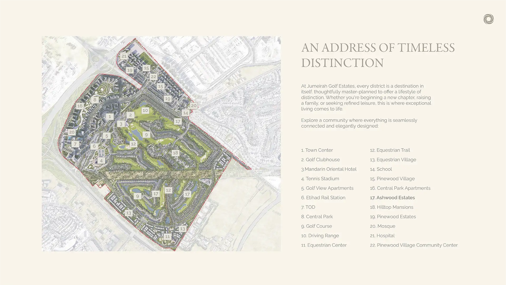 Ashwood Estates is a low-density, secure, and walkable haven with approximately 185 villas set amidst landscaped streets and green open spaces. The Hilltop Mansions command exceptional fairway views, while the community enjoys close links to the JGE clubhouse and sporting amenities.