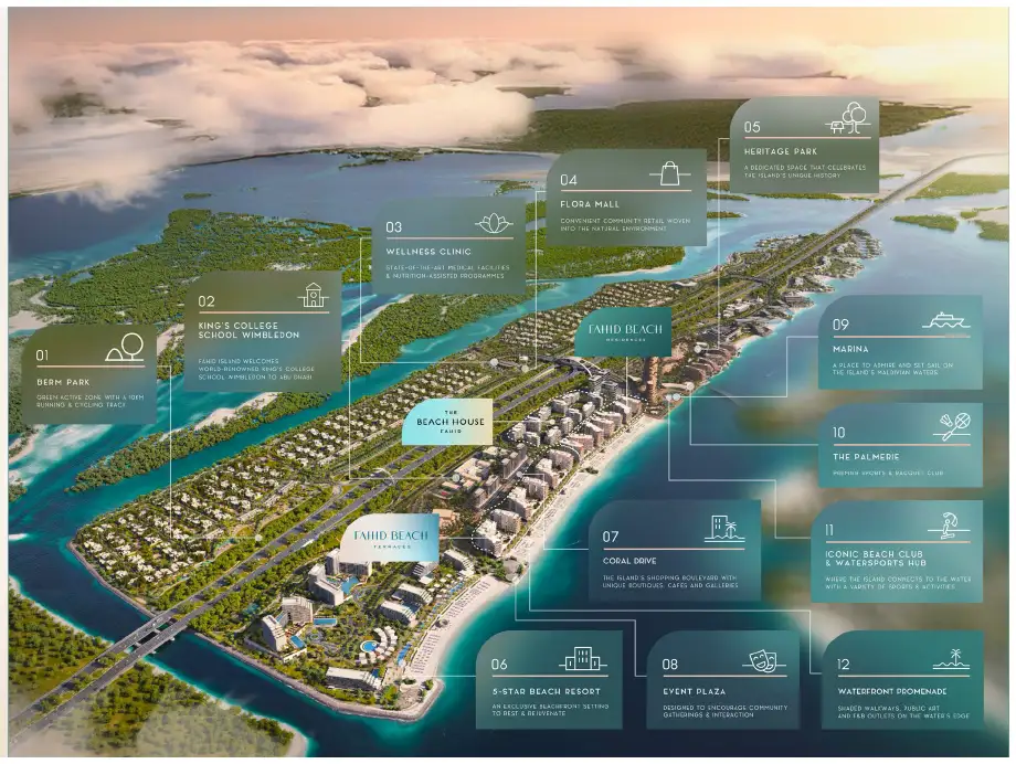 Six mid-rise buildings are set along the sand in a gentle arc, with landscaped podiums stitching them together and beach paths leading straight to the water. Car movement sits back; the front-of-house is pedestrian-first, lawns, shade, and sitting places that make “five minutes outside” an easy habit. The wider island plan layers wellness routes, community parks, and small retail nooks so you can live locally without sacrificing choice.