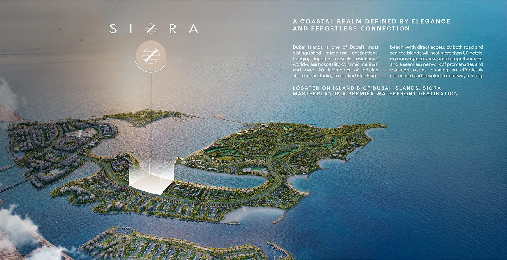 The neighbouring Siora community extends this feeling. Event lawns, beaches, shaded walkways and open plazas all respond to the natural movement of wind and water. Circulation paths are designed like ribbons linking homes to the wider island rather than boxing them in.