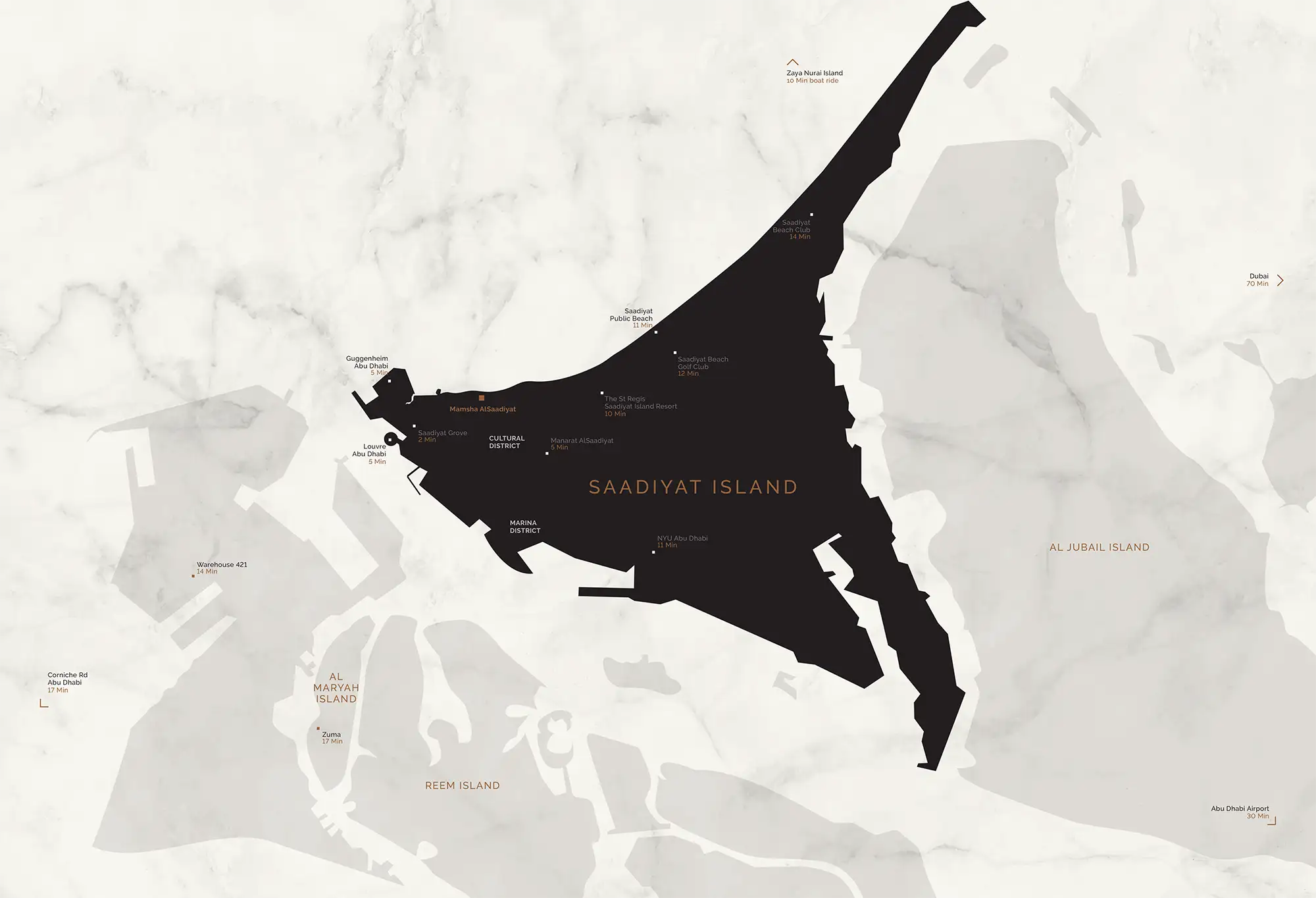The composition favours privacy and procession: a refined arrival, layered landscaping, amenity terraces that blur inside and out. Podium levels connect residents from lobby to lounges and garden courtyards without crossing public routes. Two boutique towers (approx. 226–228 units), car-free surroundings, and extensive waterfront art walks integrate the site with Saadiyat’s culture and Gulf vistas.