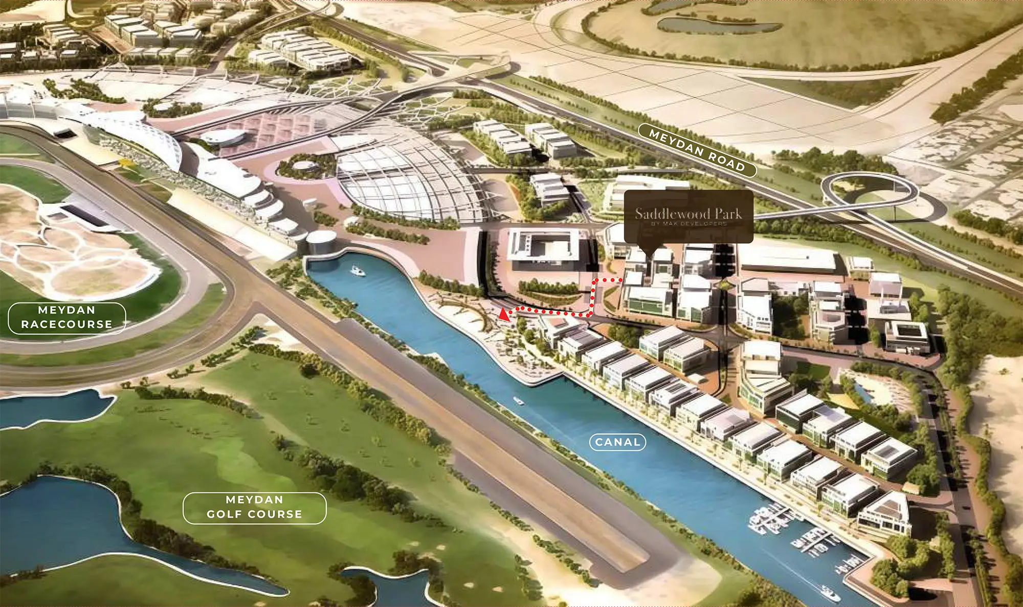 Saddlewood Park is positioned inside a wider Meydan fabric that mixes low rise greenery and key leisure anchors. The building itself is layered with wellness pockets and landscaped walkways, so residents can move from private terraces to public green spaces without jumping in a car. The rooftop and podium levels are deliberately programmed for community use rather than oversized commercial retail, which helps maintain a residential rhythm.