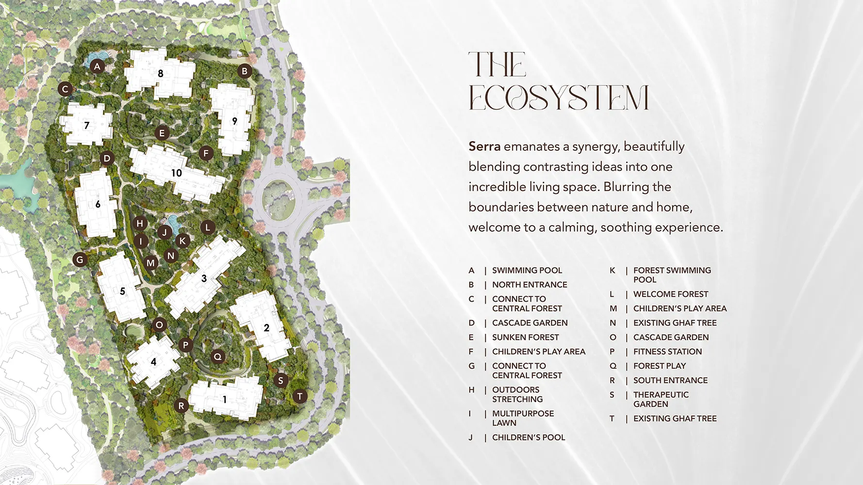 Think of Serra as one of 11 clusters across Ghaf Woods, each with its own mood but stitched together by forest trails, wellness nodes, and social clearings. The master encourages you to live horizontally as much as vertically; lobby → podium gardens → forest edge is a daily ritual, not a weekend exception.
