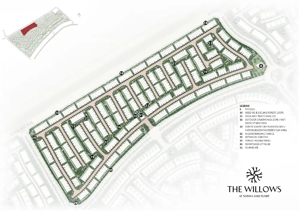 The Sobha Sanctuary master plan is built around the principle that green space is not decoration. It is the structure the community is organised around. Nearly half of the total site is open land, with green corridors running between villa clusters, connecting homes to parks, wellness loops, water features, and shared amenity zones.